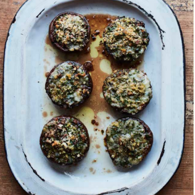 Portobello mushrooms have a robust, meaty texture making them excellent for roasting, baking and stuffing. Available year round, they are simply the larger, more mature form of the common cultivated white or chestnut mushroom. I’ve used Gorgonzola dolce here – a sweeter, milder version of Gorgonzola from Lombardy and Piedmont – but any blue cheese would be fine, and Parmesan is the best substitute for pecorino. Serve with a crisp green salad for a light lunch or with grilled fish.