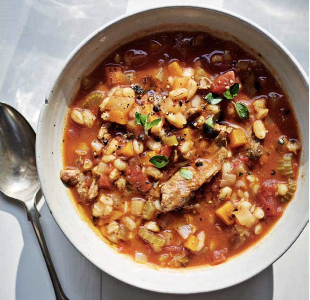 Barley has been cultivated in Italy since ancient times. It was believed to give fighters extra strength – gladiators were known as the hordearii, or ‘barley eaters’, and Roman soldiers used to march off to war with a bag of barley, which they boiled up in their helmets to make porridge. Barley is great in soups, adding a nice bite, and here it absorbs the rich flavour of the beef stock. Serve with plenty of fresh crusty bread.
