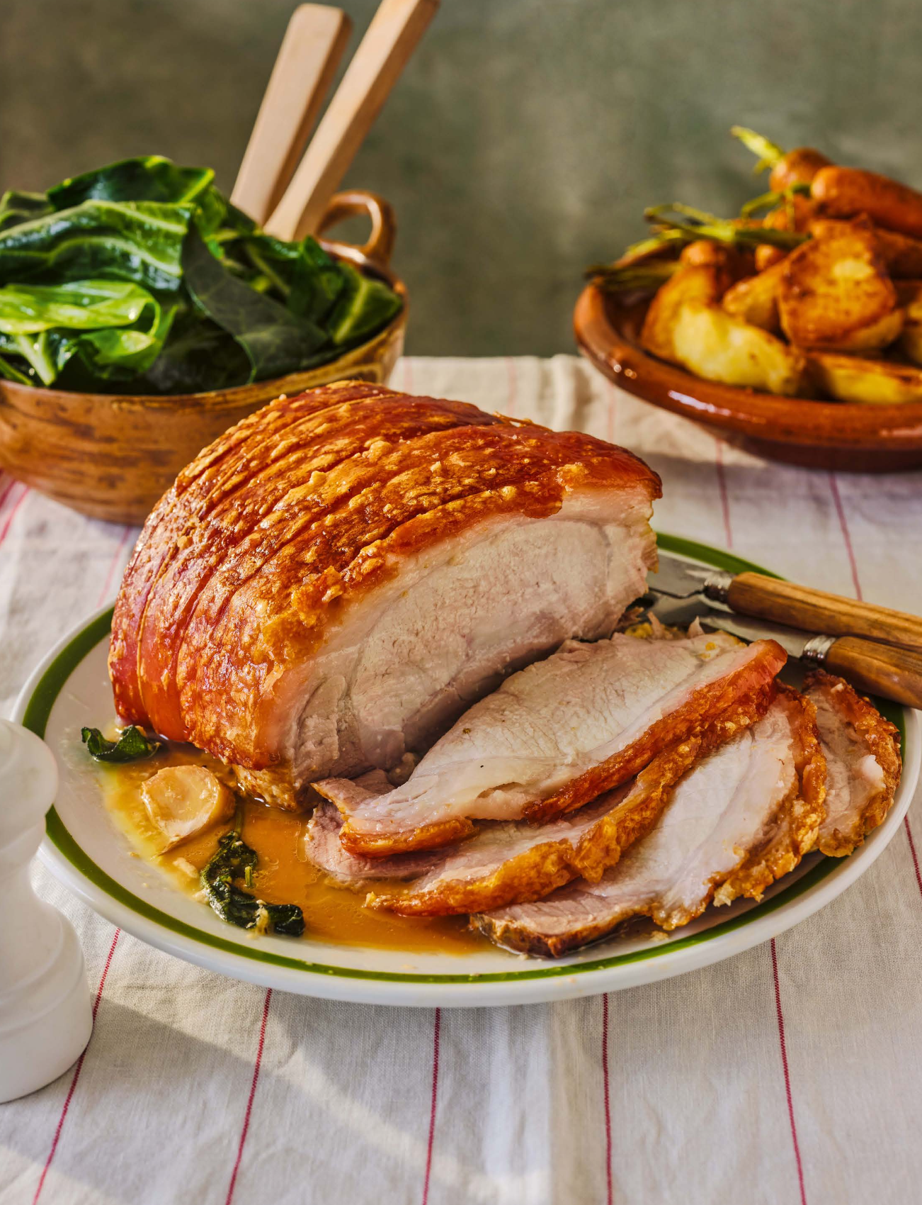 - 1.25kg g boneless rolled pork loin joint with crackling, scored, removed from the fridge 1 hour before cooking