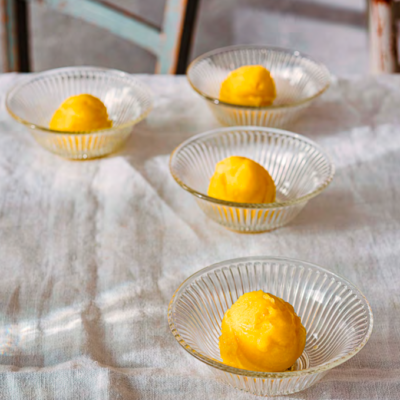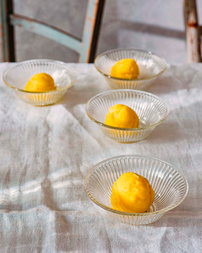 Sorbets have to be one of the easiest recipes to make. You take your chosen fruit – I have used mango in this recipe, but pineapple and mixed berries are also great – blitz in a food processor with the other ingredients and freeze. All done in five minutes. It is a fantastic dessert if you are trying to be healthy, and no one will even notice. It has a really refreshing flavour, which is great not only on hot summer days, but also after a heavy meal.