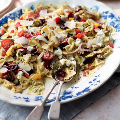 1 Cook the farfalle in a large pan of boiling, salted water until al dente.Drain and rinse under cold running water for 3 minutes, moving the pasta around in the colander so it cools more quickly. Leave to drain thoroughly.