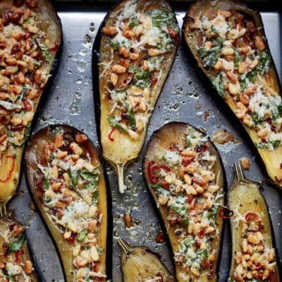 4. Remove the aubergines from the oven and spoon the pine nut mixture evenly over the top of each aubergine. Return to the oven for 5 minutes then serve.