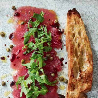 TUNA CARPACCIO WITH ROCKET, CAPERS & BALSAMIC