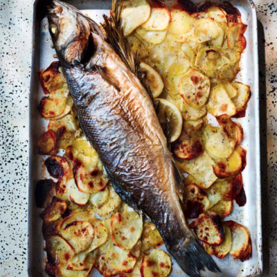 I love serving a large, whole roasted fish with potatoes like this at the table – it’s